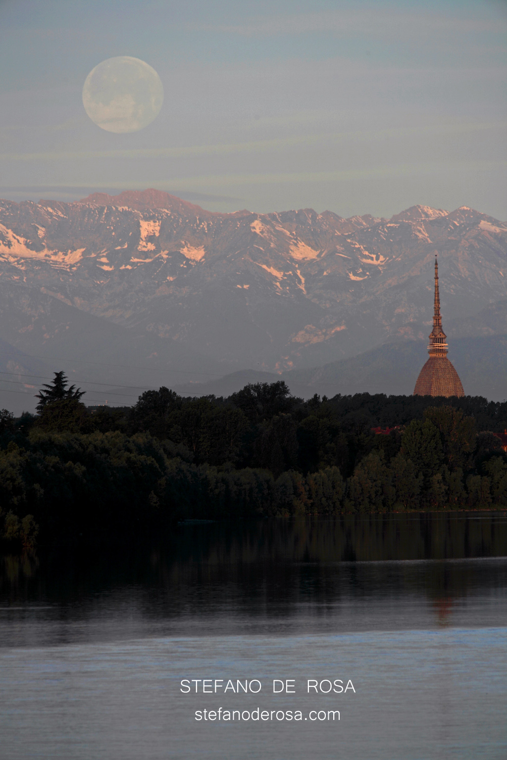Full Moon setting behind the Alps and by the Mole Antonelliana, the iconic symbol of Turin.