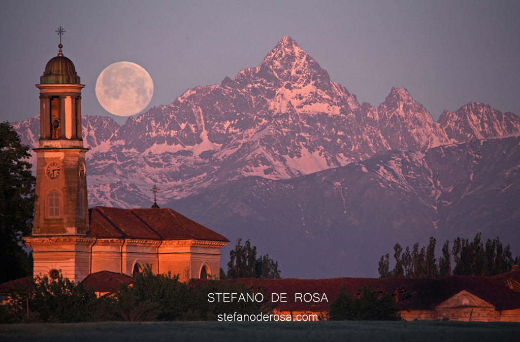 :: 15.5.2014 – Full Moon setting alongside the Monviso peak (3,843 meters high). In the foreground is the church of Borgo Cornalese, few km away from Turin ::
